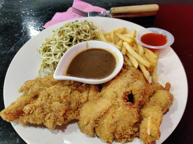 Aglio olio served with grilled chicken and fries, usually would eat here when I have classes because the service is quite fast. Quite affordable for campus students as well