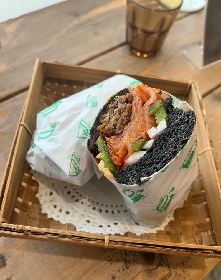 October’s Homemade charcoal ciabatta bread with korean kimchi, red cabbage, onion and beef patty taste good!!!
